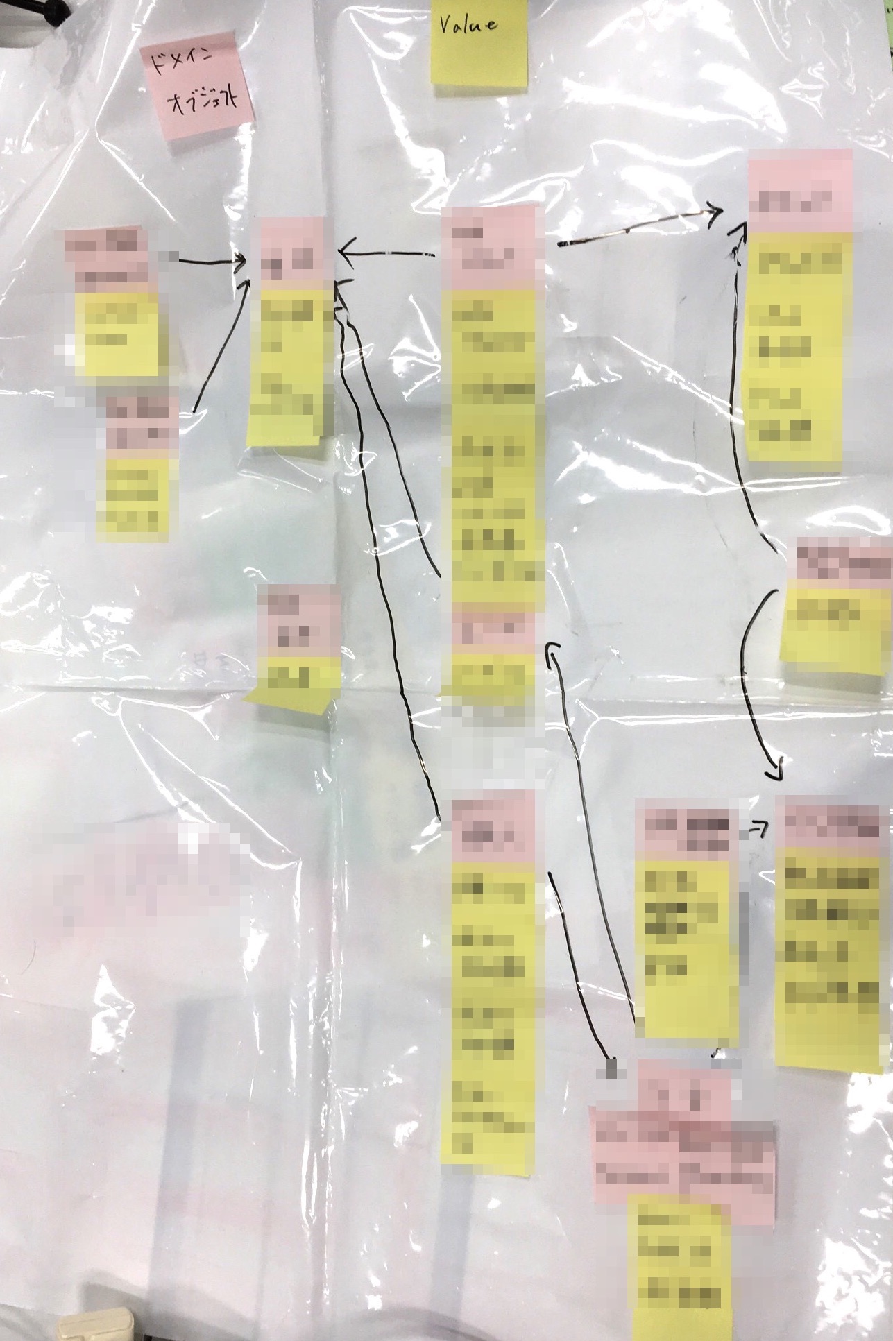 都合によりモザイクをかけていますが、このようにホワイトボードシートに付箋とペンで雑に書いていました。これを見て修正に繋がった例としては、Entity同士の関連を作らず値をマッピングすれば済む箇所があった、ValueオブジェクトにできるものをEntityにしてしまっていた等がありました。
