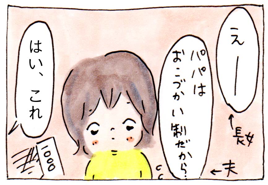 いきなりの金銭の要求でしたし、長女(7才)もパパも流すような感じだったので、こどもだましですが紙でお金をつくって次女にあげました。