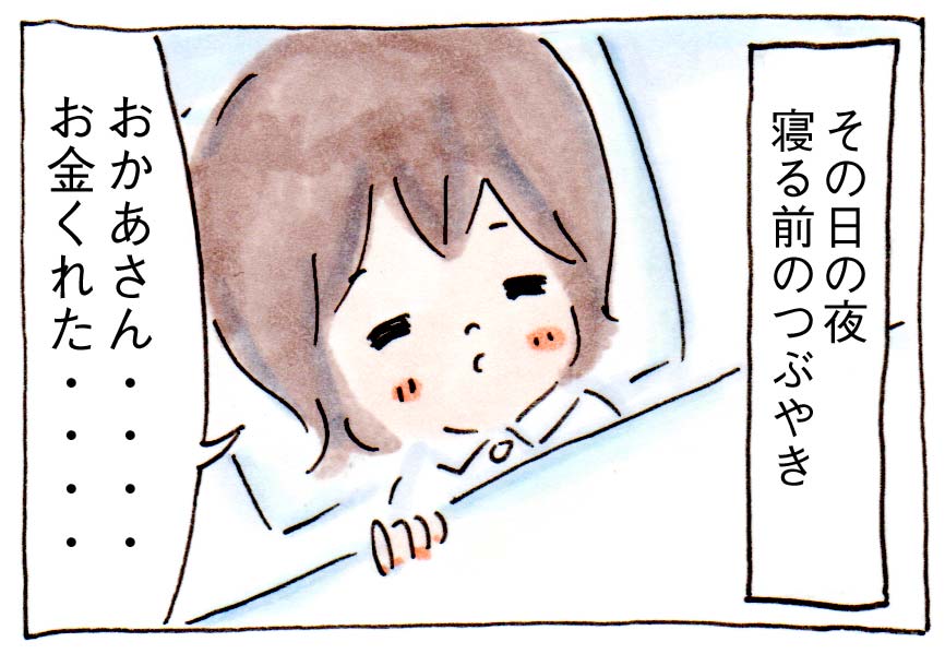 すると、その日の夜、寝る前に「おかあさん・・・・、お金くれた・・・・」とつぶやいて眠りについた次女でした。・・・かわいかったです。