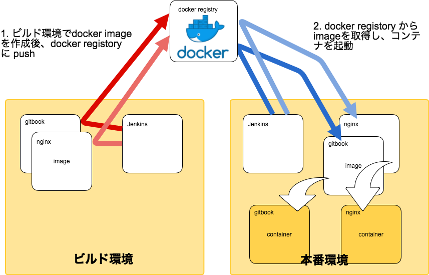 1. 「上記作成したgitbook」と「nginx」のイメージをdocker-composeで連携してJenkinsビルド環境でimegeを作成後、社内のdocker registryにpushします。