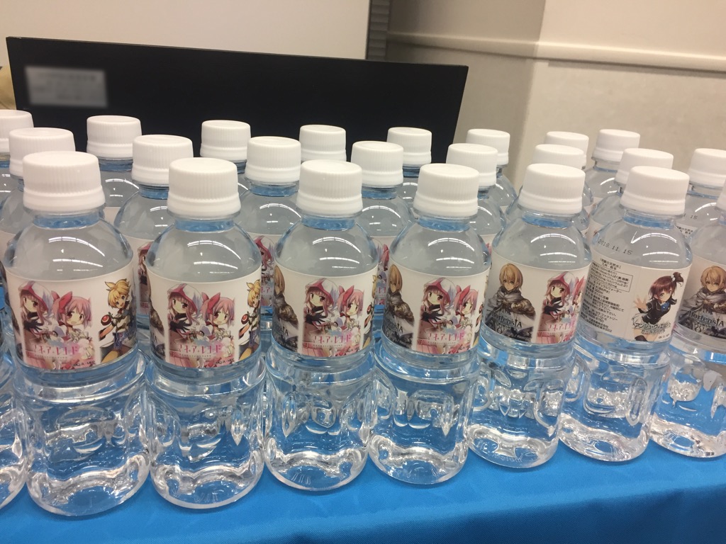 ▼f4amuraiの人気タイトルがデザインされたミネラルウォーターや、開発スタッフ描きおこしのイラストのステッカーも用意されていました!