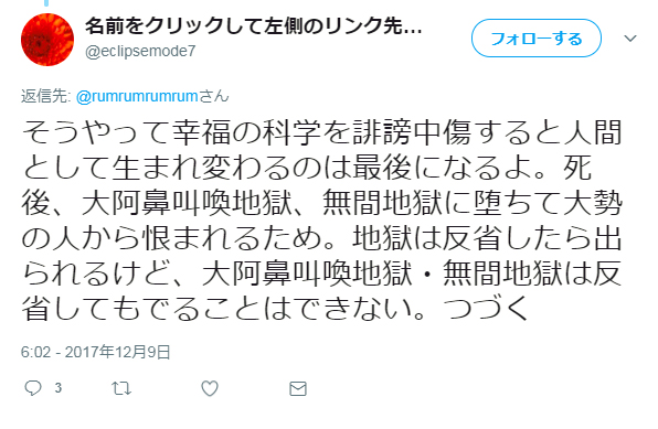 一方、Twitter上では、幸福の科学信者らしきアカウント(@eclipsemode7)が藤倉総裁に対して「無間地獄行き」などと執拗に脅す投稿を繰り返している。これをTwitterに通報したという第三者は本紙の取材に対して「Twitterは何も対応してくれていない」と語る。このアカウントは現在、上記トカナの記事を執筆したイラストレーターでライターの村田らむ氏に対して、同様に「死後、大阿鼻叫喚地獄、無間地獄に堕ち」るなどと脅す投稿を連投している。