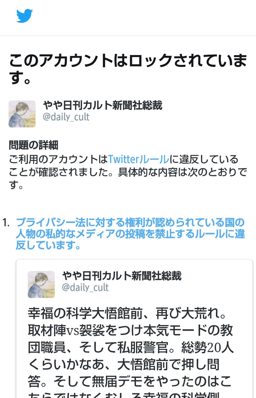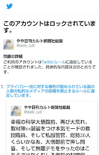 「Twitter社は、ほかのユーザーを脅すカルト信者のアカウントは放置。逆に、カルトの実体をプライバシー侵害とならない手法でリポートした藤倉総裁のアカウントはロックし、投稿を無断で削除する。通報があれば一方的に処分するという“通報至上主義”かと思いきや、実は単なる“カルト優先主義”にすぎないことが、これでハッキリした」(藤倉総裁)