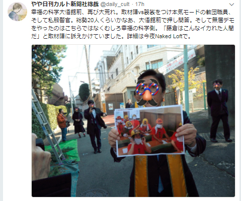 藤倉総裁は取材終了後、同日のうちに大悟館前での教団職員によるデモ活動のようすをTwitterでリポート。デモ隊の顔を隠すよう修正を施した写真も同時に投稿した。
