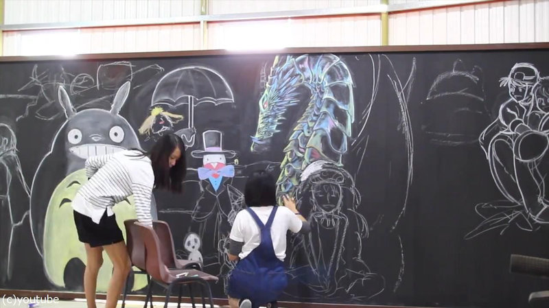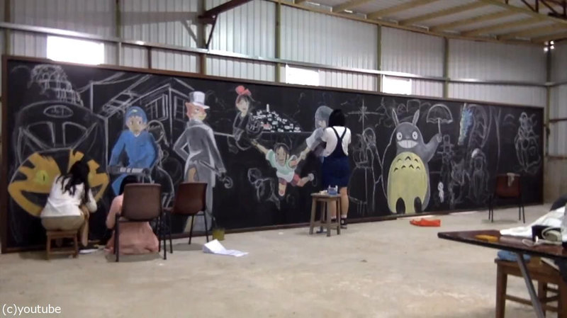 日本アニメの大ファンだという彼女たちは、ジブリ作品など多数の作品を黒板に描いてきました。