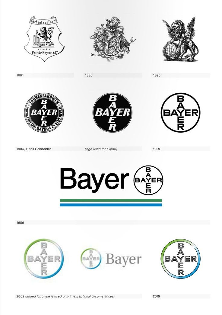 バイエル(Bayer)は途中経過が抜けているし1886年のロゴは間違ってるよ。