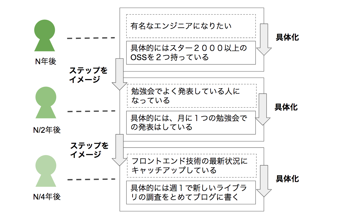 たとえば、2年後とか3年後とか比較的遠い未来のことを考えてみましょう。将来どうなっていたら良いかというようなイメージを固めていきます。たとえば、めちゃくちゃ優秀なエンジニアになりたいとか、お金持ちになりたいとか、モテまくりたいとかそういうことです。