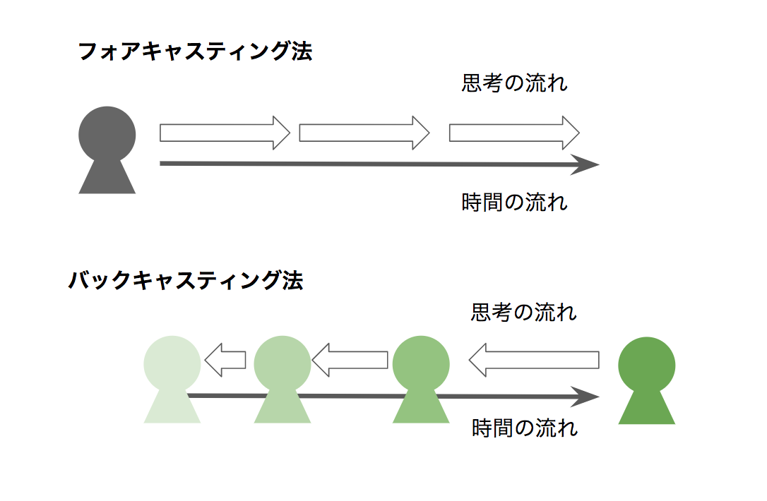 バックキャスティング法に対して、現在の自分からの積み上げで考える思考法を「フォアキャスティング」といいます。こういうことをしていたら、いずれこうなって、そしたらこうしてというように現在の自分を出発点に将来を予見して目標を立てる方法です。これでは、現在の自分を超える発想が出てきません。
