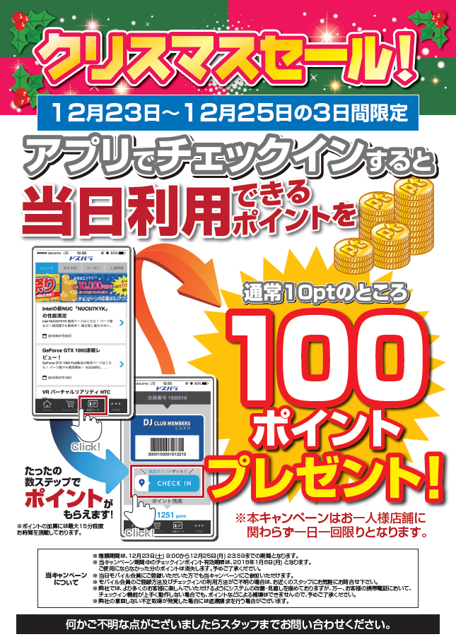 来店ポイント増額は 2017/12/23(土) 9:00 ~ 2017/12/25(火) 23:59 となります。増額分のポイントに関しては、2018年1月8日(月)までの期間限定となりますので