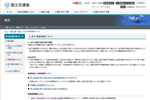 国土交通省のホームページの申請手続きのページ。「無人航空機の飛行に関する許可・承認申請書」は、このページからダウンロードできます
