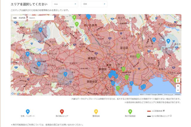 DJIの「フライトマップ」。残念ながら、都心では飛ばせる場所がほとんどありません