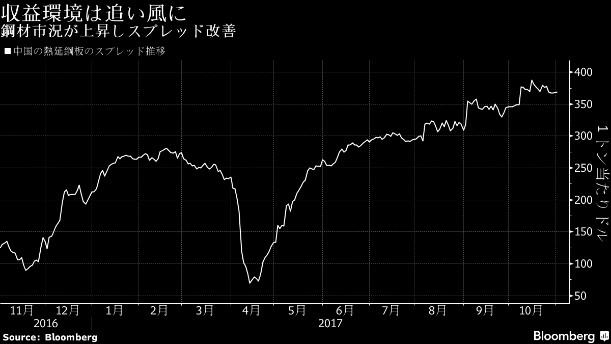 中国では違法操業していた鉄鋼業者に対する政府の取り締まり強化で供給量が絞られる一方、インフラ投資や自動車生産の増加で中国国内の需要は堅調。需給の引き締まりを反映して中国からの鋼材輸出は9月まで14カ月連続で前年同月を下回った。