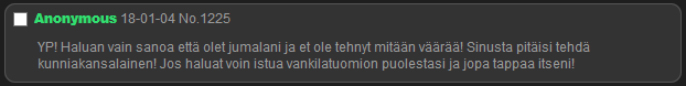 Oli itsestään selvää, että lapsipornoa en hyväksy missään tapauksessa. Toinen asia oli sellainen, että en halunnut muiden ihmisten kiusaamista. En esimerkiksi halunnut, että joku uhkaisi siellä toista. Tokihan tällaistakin Sipulikanavalle postattiin, mutta poistin sen kaiken. Ja sen jälkeen minut haukuttin ja kysyttiin, että "miksi poistat asiallista keskustelua?". Mutta kun en halunnut mitään sellaista, en ihmisten häiritsemistä, nimiä, naamoja, tai muita tunnistettavia juttuja. Tokihan siellä joskus sellaista oli, en minäkään täydellinen moderaattori ollut, ja yksinään kun teki kaiken, niin ei aina ollut aikaa tehdä asioita niin hyvin kuin olisi halunnut.