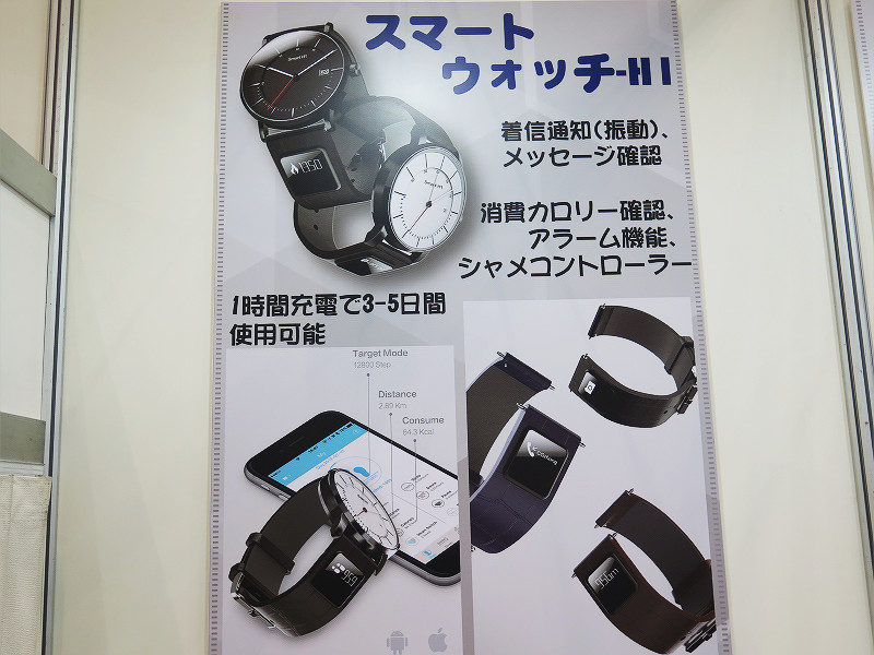 説明員によると、今回のスマートウォッチ-H1を含むブース内の展示物(ARゴーグルやヘッドマウント端末など)については参考展示の扱いということで、現在販売先(取り扱い)してくれる業者・企業を探しているそうです。
