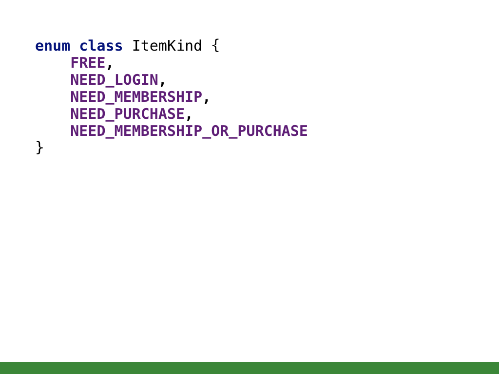 アイテムをドメインモデルとして考えると、アイテムの属性として自然なのは個々の Boolean よりも、どういうアイテムなのかという種類です。
