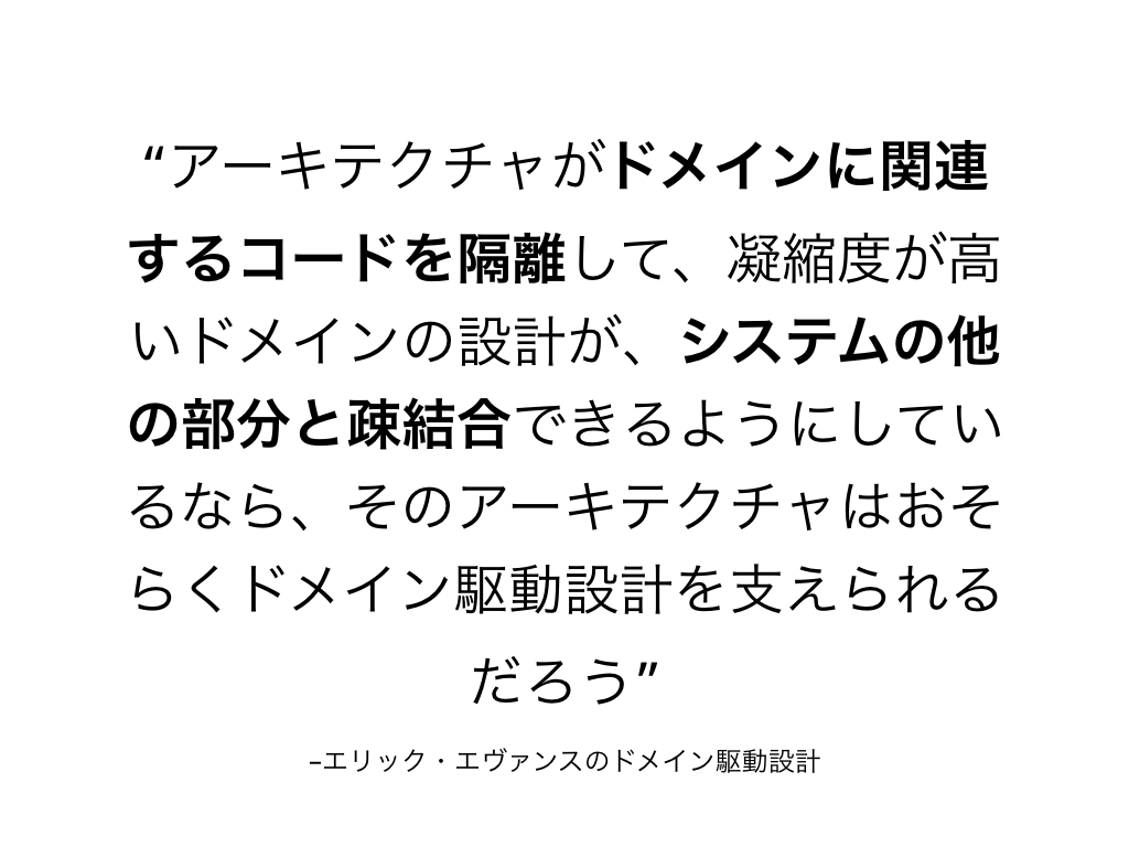 「アーキテクチャがドメインに関連するコードを隔離して、凝縮度が高いドメインの設計が、システムの他の部分と疎結合できるようにしているなら、そのアーキテクチャはおそらくドメイン駆動設計を支えられるだろう」