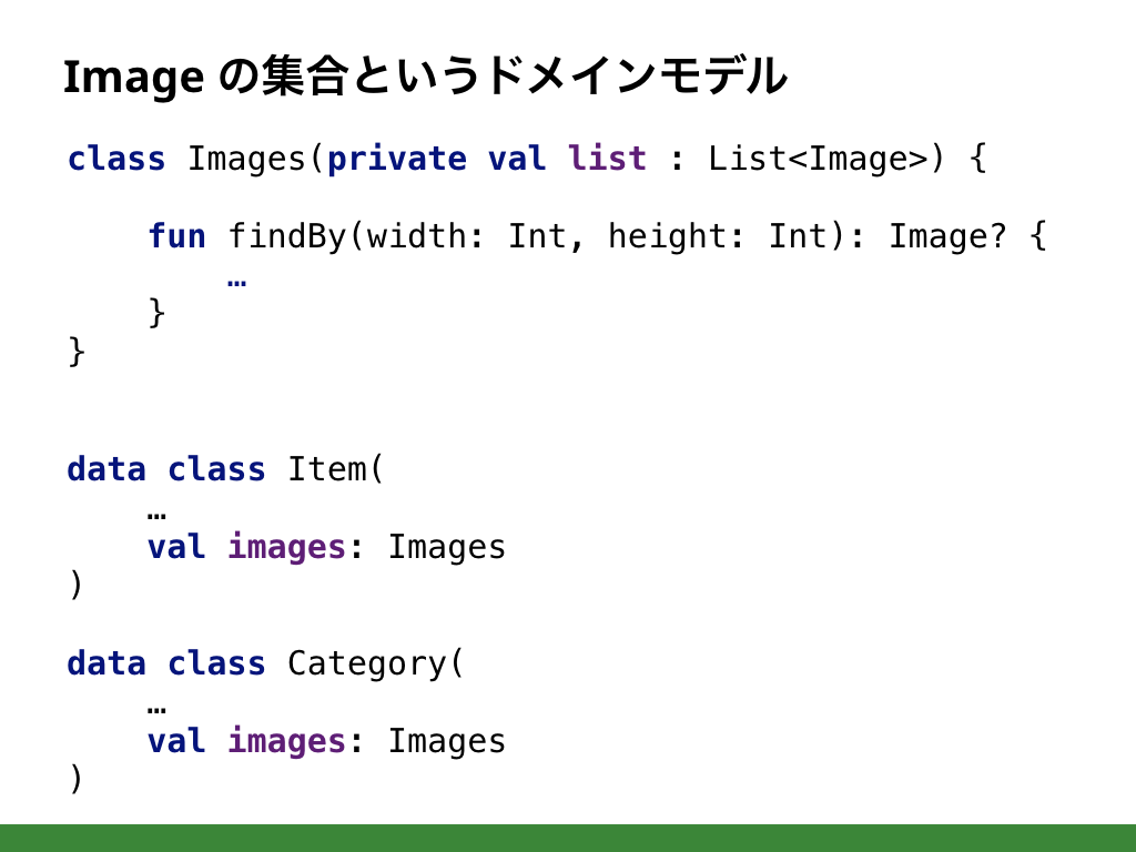 この例では Image に置きましたが、表現するドメインモデルが異なれば異なる実装になるでしょう。画一的は判断基準はなく、頭の中のドメインモデルにとって自然かどうかだけです。