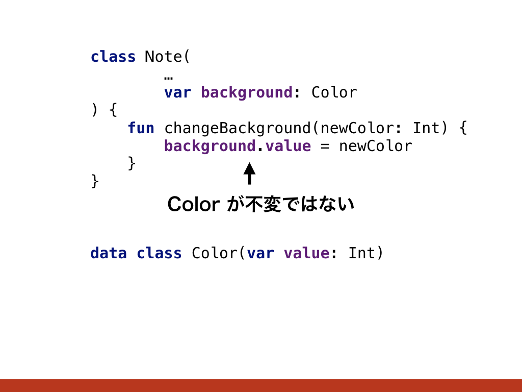 例えば Color オブジェクトであれば、このように内部で保持する色の値を可変にするのはおすすめできません。