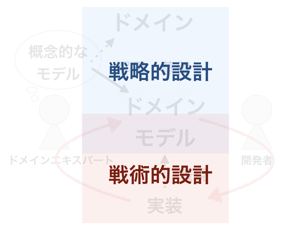 ドメインモデルを作り上げるために役立つ手法が戦略的設計、ドメインモデルからそれを表現した実装を行っていくのに役立つ手法が戦術的設計です。