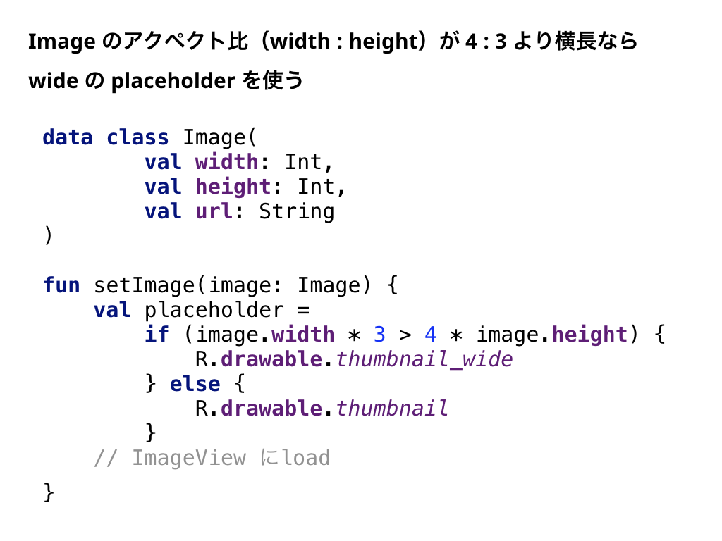 画像の縦横サイズとURLを持つ Image というオブジェクトがあります。画像のアクペクト比が 4 : 3 より横長、例えば 16 : 9 とかだったら、 wide 用の placeholder を使う、という仕様です。