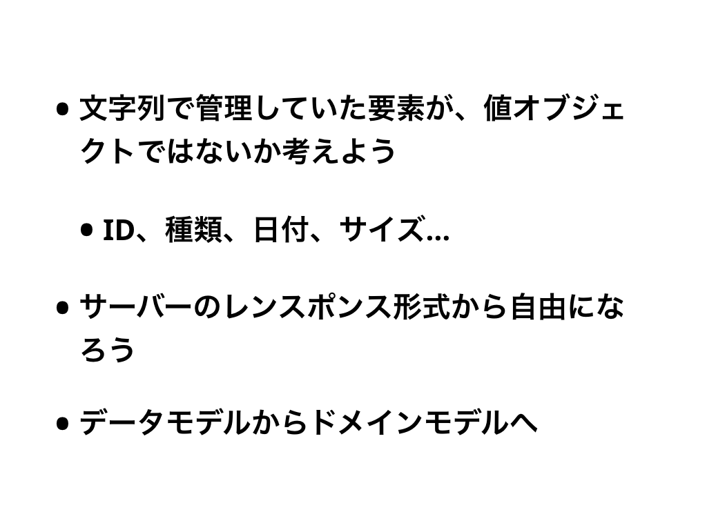 サーバーのレスポンス形式は時としてモデルをうまく表現できていないことがあります。それに引きづられてドメインモデル貧血症になっていませんか?一旦レスポンス形式のことは忘れて、どういうモデルがあるべきかを考えましょう。