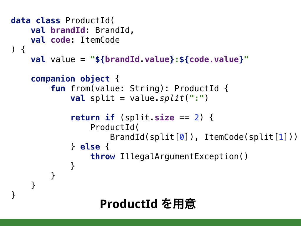 文字列で取り回している要素が値オブジェクトではないか考えましょう。ID、種類、日付、サイズなどは値オブジェクトを導入するよいスタート地点です。