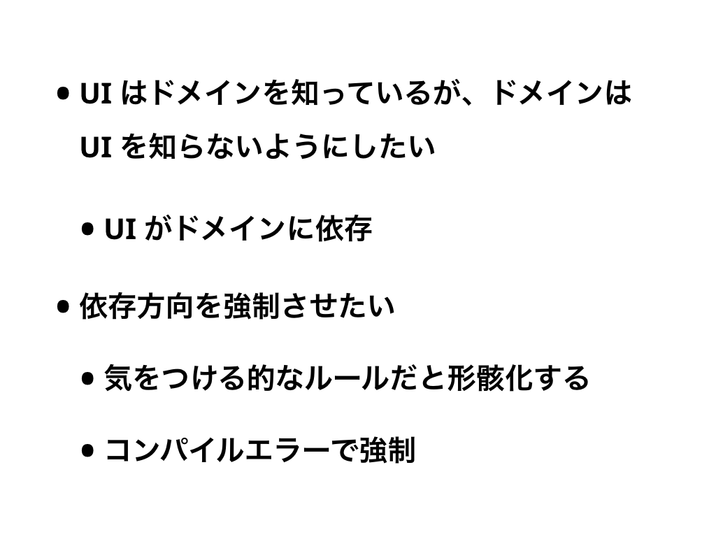 単純にパッケージを分けるだけだと、ドメインからUIのクラスを見ようと思ったら見えてしまいます。