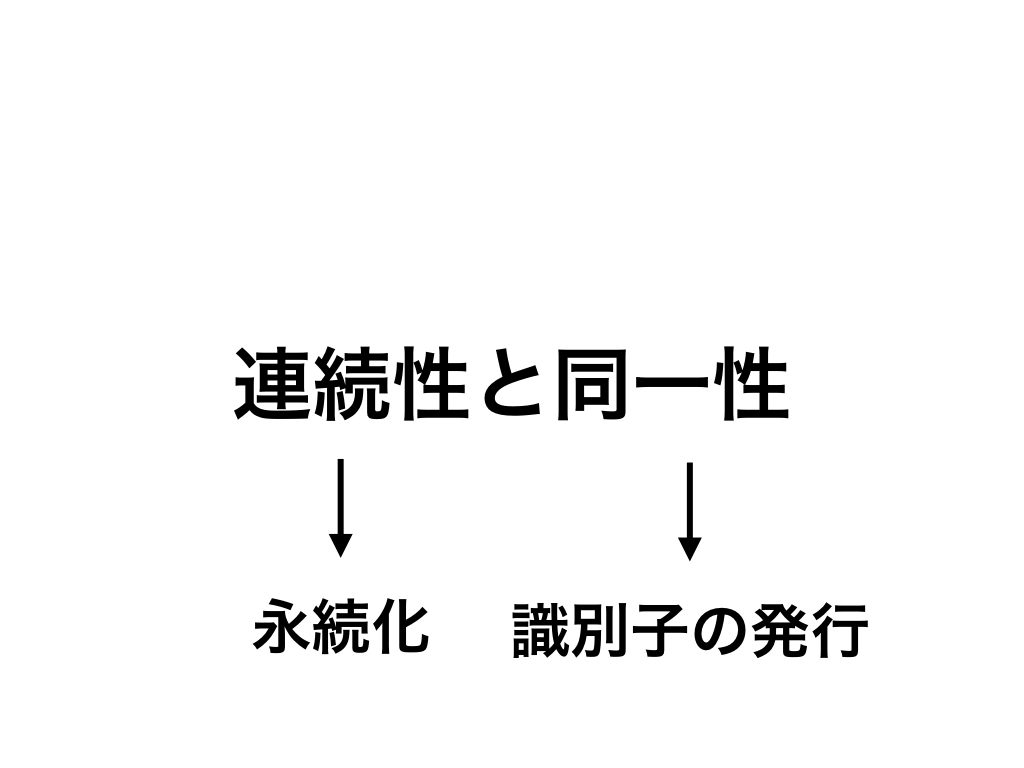 この連続性と同一性をソフトウェアで表現するときに問題になるのが、連続性を維持するためにどう永続化するかと、同一性を持たせるための識別子をどう発行するかです。