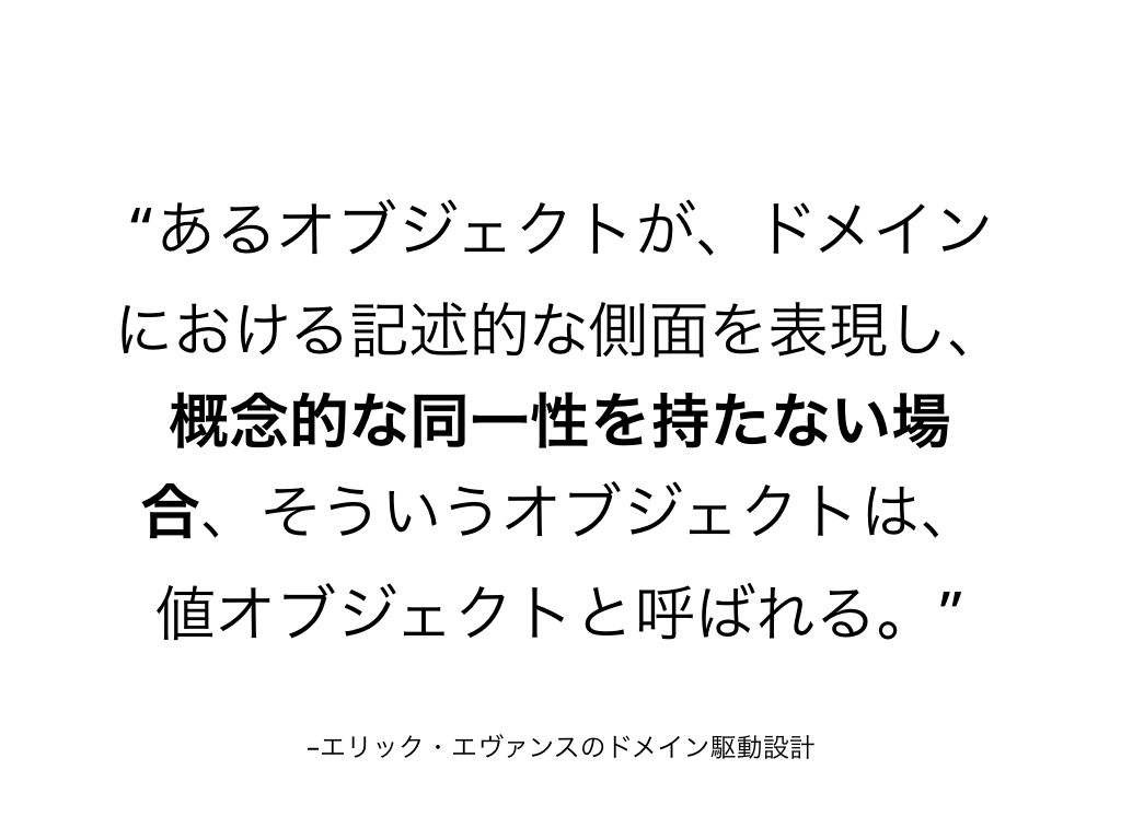「あるオブジェクトが、ドメインにおける記述的な側面を表現し、概念的な同一性を持たない場合、そういうオブジェクトは、値オブジェクトと呼ばれる。」