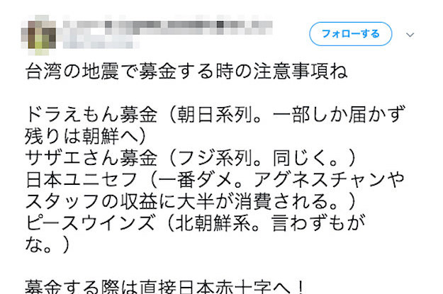 アカウントは、テレビ朝日系列による「ドラえもん募金」など4つの募金・団体を名指し、寄付しても被災地には一部しか届かないなどとしていた。いずれの団体も、ツイート内容を否定したことをBuzzFeed Newsなど複数のインターネットメディアが報じていた。