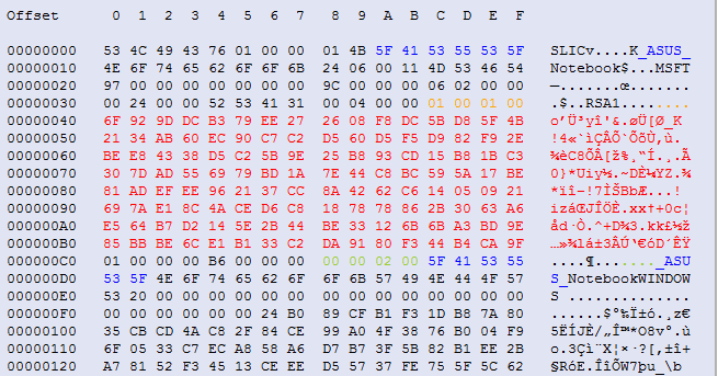 Open the resulting binary file in a Hex editor, for example, XVI32. Compare the SLIC content (in SLIC dump toolkit) with the binary OEM certificate (in XVI32).