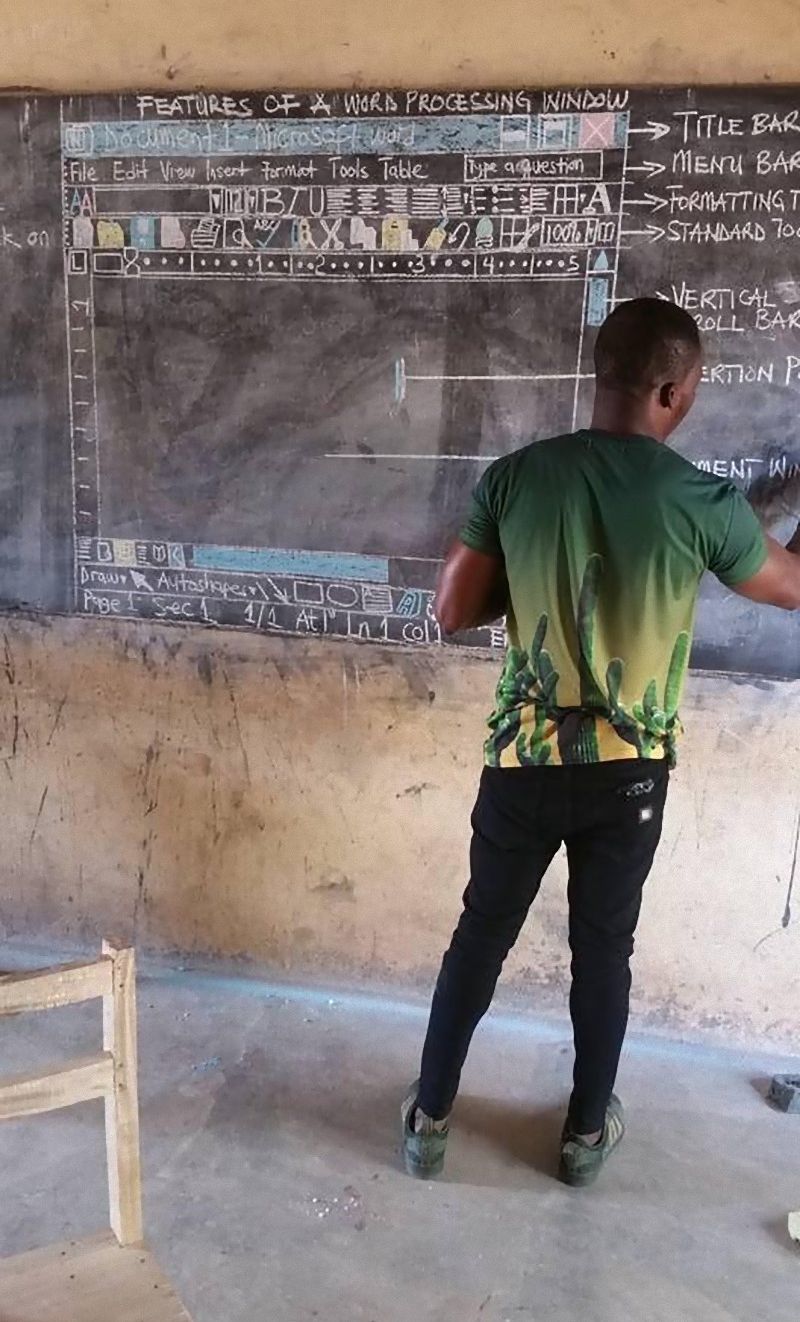 それと、これはアフリカの田舎では標準の教え方だよ。その通り、子どもらは電気もパソコンもなく、ITを学ぶことを期待されても気が滅入るし欲求不満というのが現実だ。