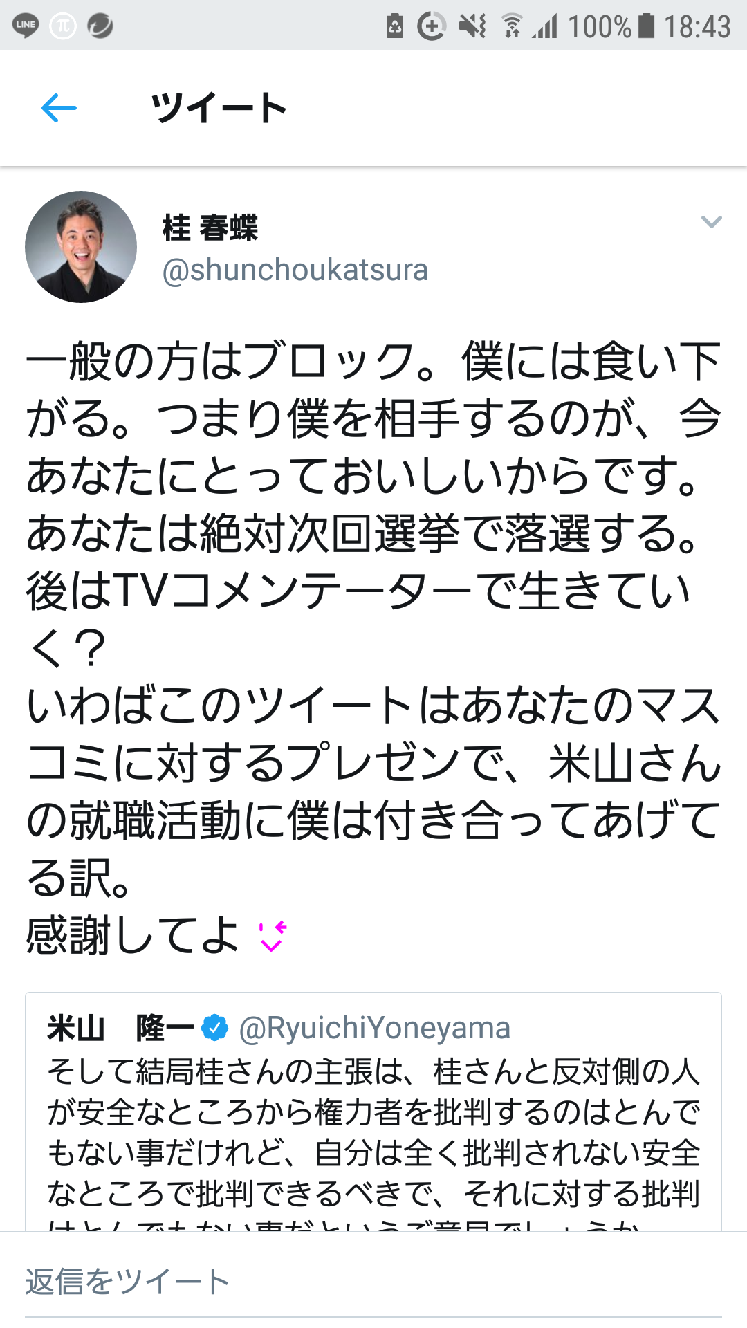 フットの二人が春蝶の大好きな自己責任論使って割と筋の通った批判しとるから答えに詰まったんやろうなぁ