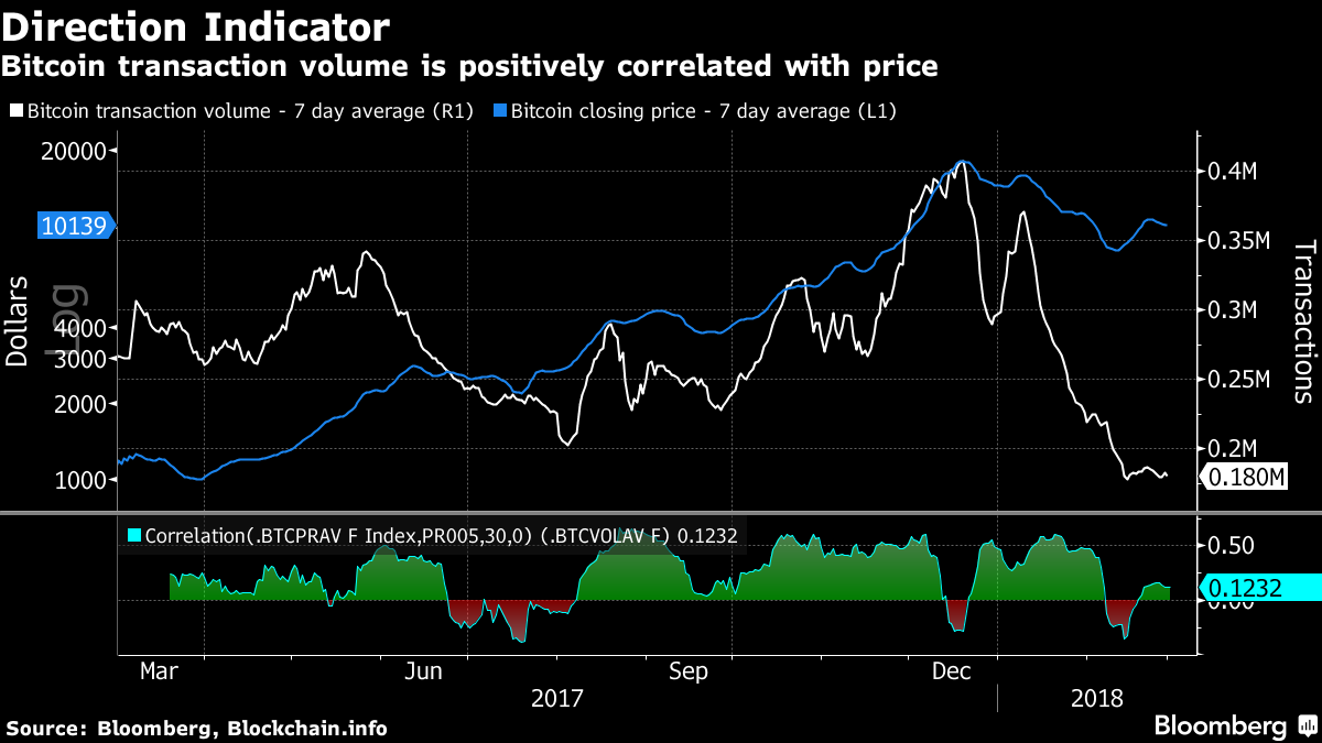 仮想通貨ビットコインは今年初めに急落し、最高値から約60%安となったが、同時に取引件数も急減少していた。