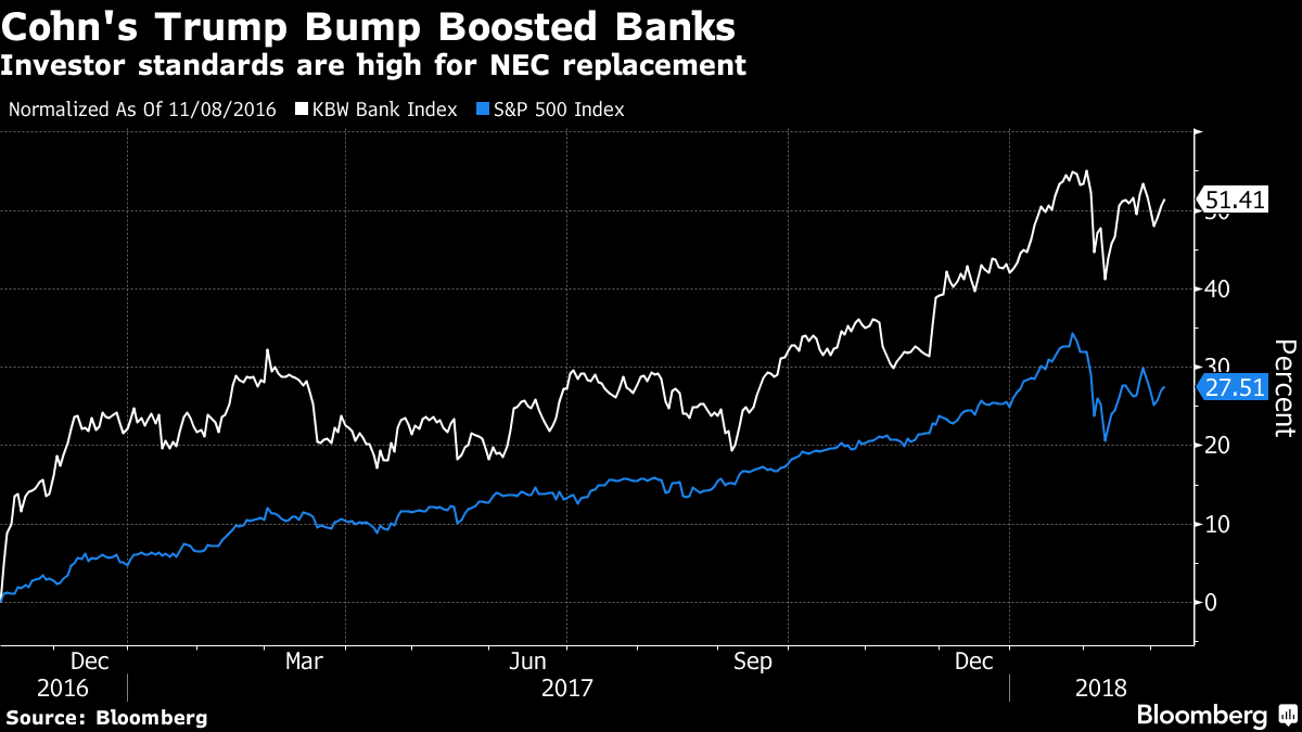 KBW銀行指数は2016年大統領選でのトランプ氏の当選以降、コーン氏が提唱した減税と規制緩和への期待から50%上昇したが、7日は一時1.3%下落した後、変わらずで終了。米銀ゴールドマン・サックス・グループの株価は一時2.2%、バンク・オブ・アメリカ(BofA)は1.7%、JPモルガン・チェースは1.8%それぞれ下落した。