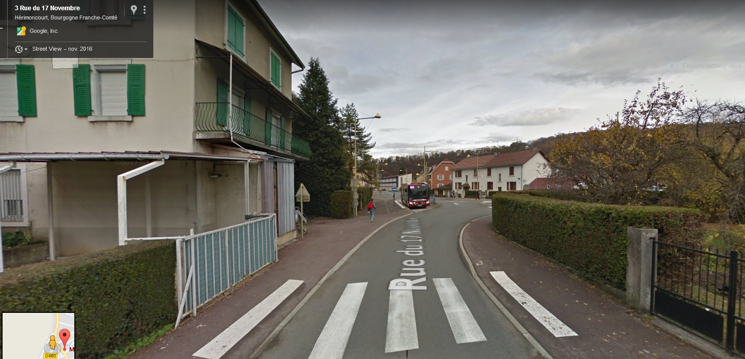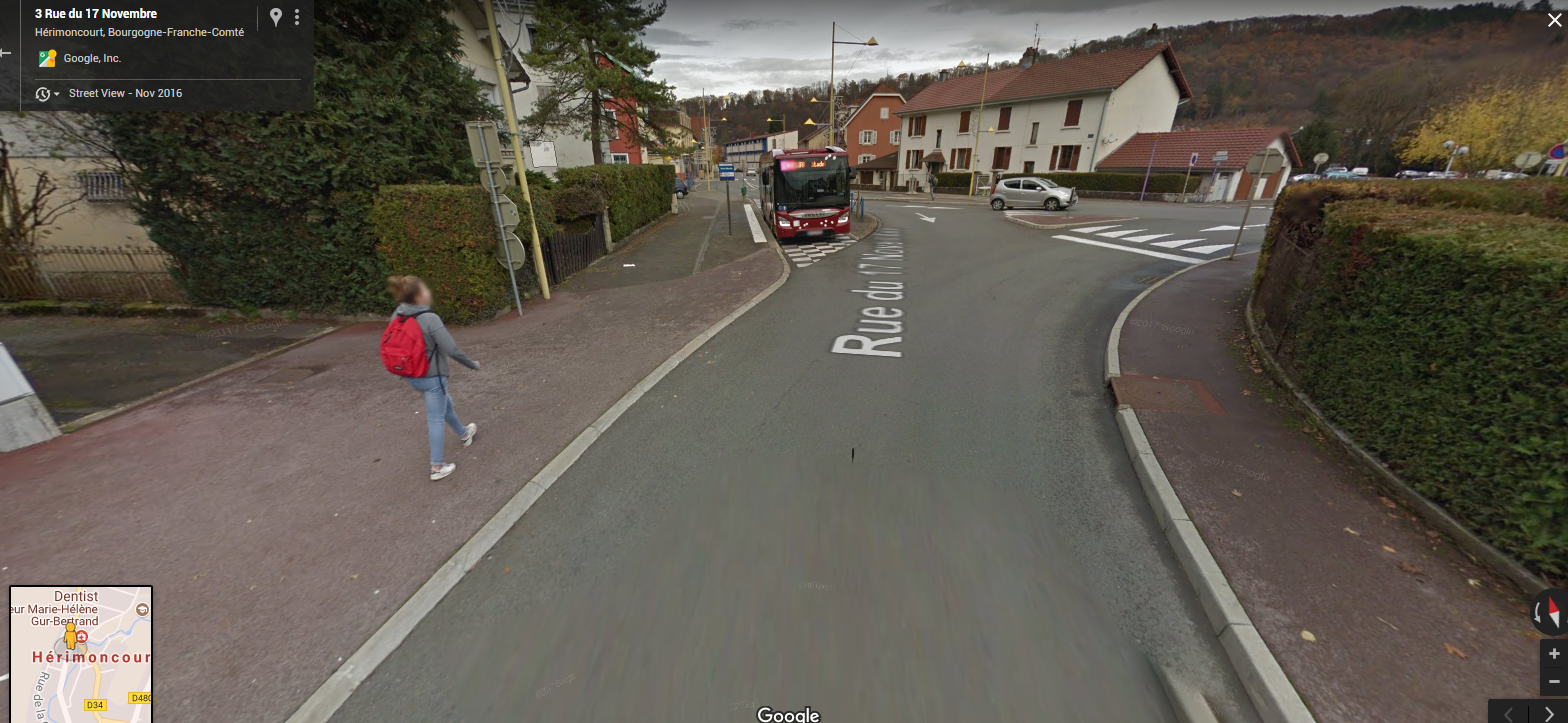 J'arrivais à pied par là, et on voit juste après le panneau de bus l'entrée de la ruelle et donc j'arrive au niveau de la photo et je vois la voiture de gendarmerie tournée très vite là.
