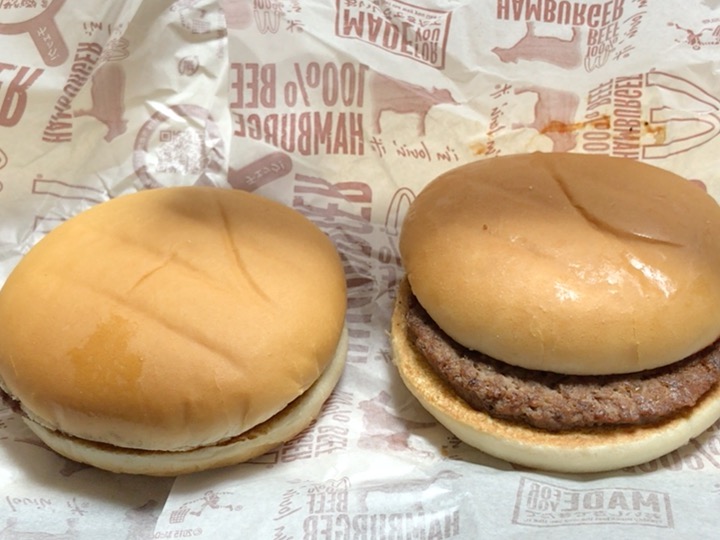 実際に”倍ハンバーガー200円”と”ハンバーガー2個200円”を比較してみた。