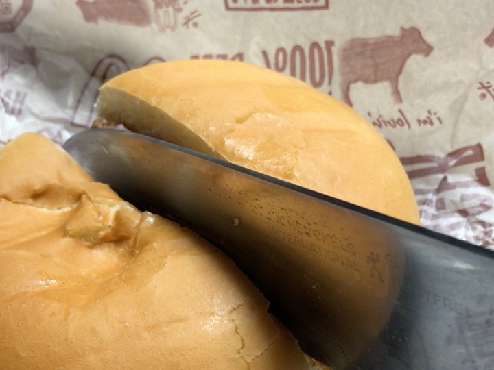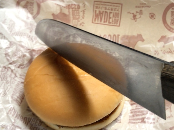 とりあえず、ハンバーガー2個で作った倍バーガーを切ってみます。