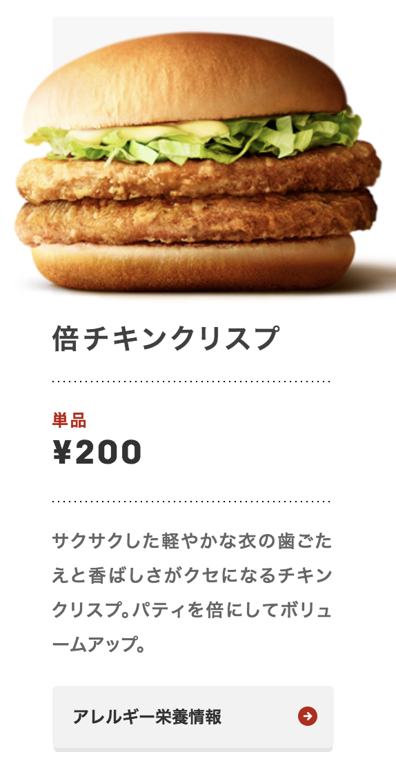 そうです。 チキンクリスプもハンバーガーと全く同じことが言えます。