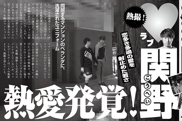 週刊誌の誌面を模した画像には、同チームの多嶋朝飛選手と関野剛平選手がプライベートで手を繋ぐ様子を激写したような写真とともに、「多嶋・関野、熱愛発覚!」という見出しの架空の記事を掲載。