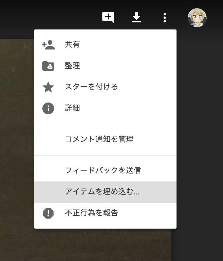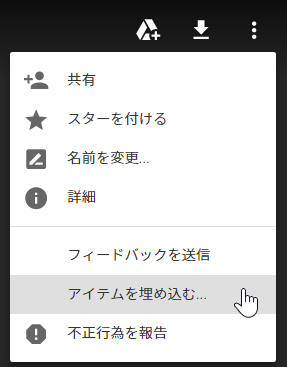 - 再び右上の︙(その他の操作)を押すとさっきまで無かったアイテムを埋め込む…が現れるので押す