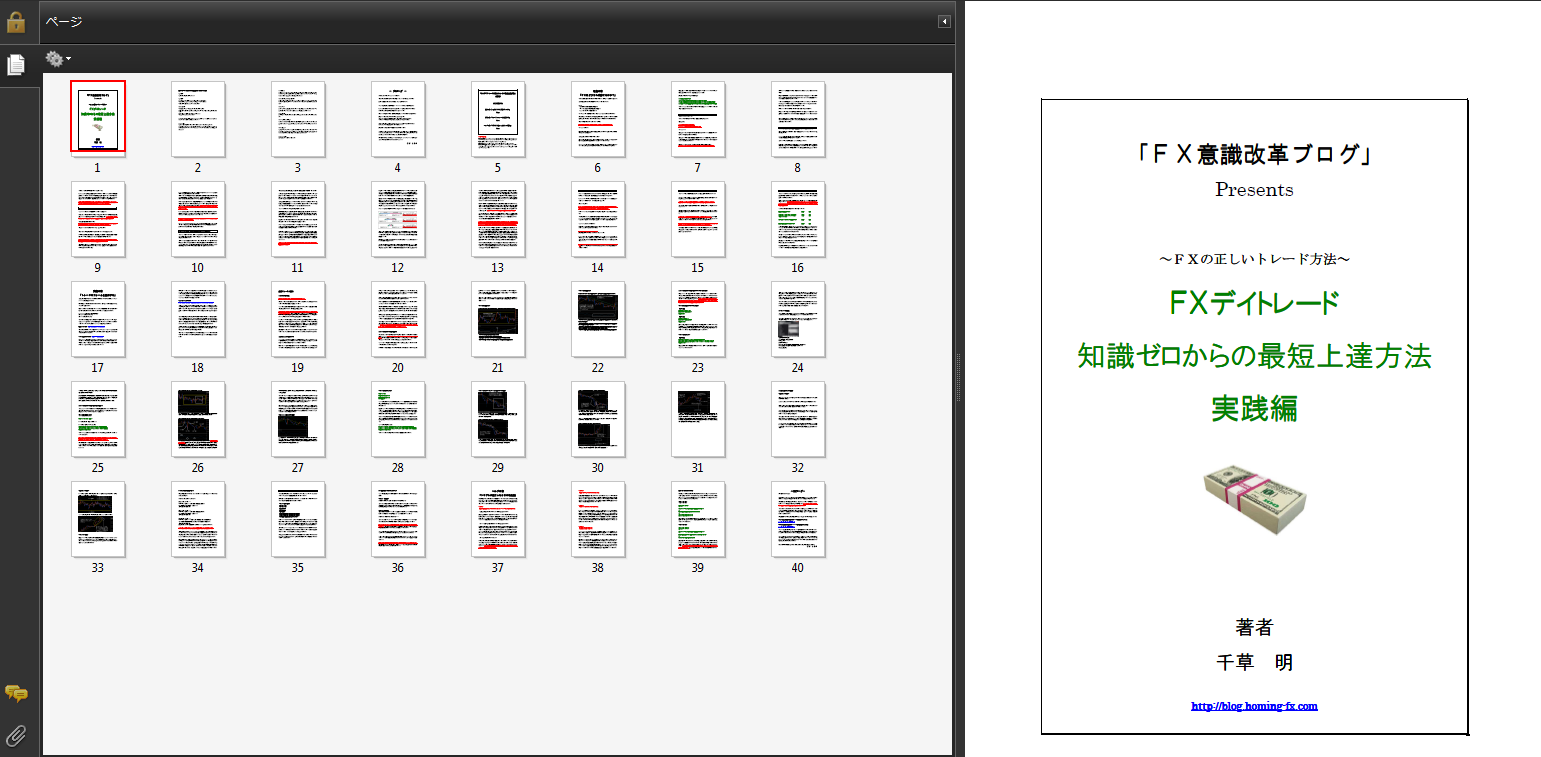 本書全体のサムネイル マニュアルPDF 40ページ 理論の章「FXはどうやれば勝てるのか?」 この章では、FXで勝つための具体的な方法について解説します。断言しますが、この方法を知らなければ、トレードで恒常的に勝つことは不可能です。しかしながら、FX業者もトレード雑誌などをみても、これについてまともに説明されている方はほとんどいません。独学では気づきにくいのです。なので、最初に勝つための方法をしっかり頭に入れてほしいのです。 実践の章「トレードのフォームを習得する」 理論の章でどうやれば勝てるかわかったら、では実際に具体的な手法とルールを使って利益を積み重ねていきます。素振りを何回も繰り返すようにして、トレードのフォームを固めてください。この章はリアルタイムでトレードをした動画の内容の要点となります。動画をあわせてご覧いただければ、より理解が深まるはずです。 ヘルプの章「トラブルが起こったときの対処法」 ルールを破りそうになったときはどう対処すればいいか。トレードの常軌を逸さないための対処法をまとめました。本書の実践中に自分の欲望を制御できなくなってしまったら、深呼吸してからこれを読んでください。 動画解説 ファイル01~ファイル06 収録計約4時間 ファイル01 トレードの準備 14分17秒 本書の実践をしていただく前に、デモ口座の登録の仕方と、トレードの環境設定方法について説明します。FXの経験が浅い方でも、最初からご説明していますのですんなり練習トレードの環境が整えられるはずです。 ファイル02 トレンド相場でのトレード方法 43分49秒 トレンド相場での手法を使って、実際にリアルタイムでトレードをしながら解説をしていきます。トレンド相場からレンジ相場に移る場面での対処法なども説明します。どこがチャートの優位点なのか、そしてどこで利食いや損切をするのか、こちらで学んでください。 ファイル03 レンジ相場でのトレード方法 45分34秒 レンジ相場での手法を使って、同じく実際にリアルタイムでトレードをしながら解説をしていきます。レンジブレイクから動いたときのトレーディングも解説しています。 ファイル04 利益確定の延長法/裁量感覚の身に着け方 1時間08分46秒 レンジ相場でのトレーディングの続きと、利益を延長していく方法、そして裁量感覚による相場の流れの見方を解説しています。ファイル01~03の続きとしてリアルタイムトレードをしながらエントリーイクジットのポイント解説などもしています。最後に取引結果の成績を示してどのくらいの期待値を持つトレードであったかを振り返ります。 ファイル05 長期足と短期足でトレンドが逆行しているケースのトレード方法 18分21秒 長期足の1時間と短期足の5分のトレンドが逆行している場合、どうトレードすればいいかについて解説をします。つまり乱高下の対処法です。また、投機の奥義といえる「安くなったら買う、高くなったら売る」がどういう意味なのかについても解説をしています。 ファイル06 千草明からのメッセージ 37分24秒 デモから実戦トレードに移る前に何に気をつけなければならないか? 千草明からFXに挑戦しようとする人たちに贈る実体験に基づくメッセージです。 ※ファイル04~06は、特典として発表後に追加されたものです。こちらは購入後にお知らせする特設サイトにて公開をしております。ファイル06を持ちまして完結となります。 下の動画は、ファイル02のサンプル動画です。エントリー及びイクジット判断まで丁寧に解説していきます。すべて動いているリアルタイムのチャートの動画であり、実際にエントリーしてどうなったかについて結果を見て検証解説をしています。もちろん都合の悪い部分を編集等で隠すなどはしていません。リアルタイムトレードの結果の約定画面も同時に撮影しています。 02ファイルサンプル動画 ※ウインドウズメディアプレイヤー及びクイックタイムで再生可能 FX初心者ですが理解できますか? 書店で売られている本で、FXの一般知識を身につけていただければ、理解できる内容です。 「相場観マスターブック」と内容は違いますか? 本書は、「相場観マスターブック」の前段階に読んで頂きたい本となります。こちらでどうやれば利益を上げられるか? その実践的な練習方法を知って頂きます。そのあとで利益をさらに伸ばすために値動きというものをつかむために「相場観マスターブック」を読んでいただくことを推奨しています。ただ、動画でもトレードプランの作り方や値動き把握のコツについては解説をしていますので、「相場観マスターブック」の内容を「実践」するのに役立つと考えています。 「確率的裁量トレード入門」と内容は違いますか? 同じく、「確率的裁量トレード入門」の前段階に読んで頂きたい本となります。こちらで基礎を身に着けて頂いてから、リスクリワード比率の調整をして勝率・利益率をさらに高めるために「確率的裁量トレード入門」を読