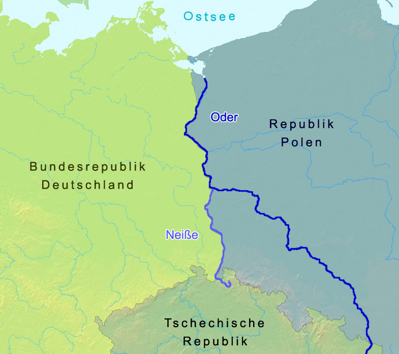 | ドイツ・ポーランド国境条約(1990年に署名)は、1945年以来未確定だったドイツとポーランドの国境を画定した条約。ドイツはこの条約によってオーデル・ナイセ線以東に対する領土要求を完全に放棄することで、ポーランドとの友好関係を強化することを選んだ。 |