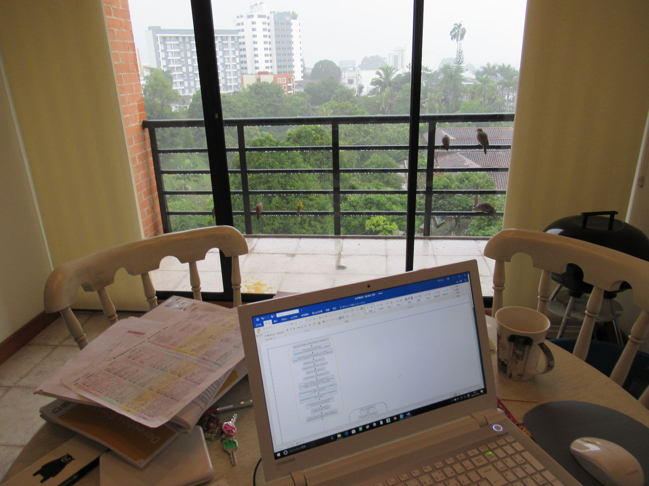 パソコンが仕事部屋とダイニングテーブルを行ったり来たり。家の中でも気分転換が必要です。ここはダイニングテーブル。外は雨です。本当に毎日よく雨が降ります。いつからか忘れるほどず~~っと降水確率は毎日100%。小鳥たちが避難と餌をついばみに来ています。ベランダの外枠に数羽止まっているのが見えますね?