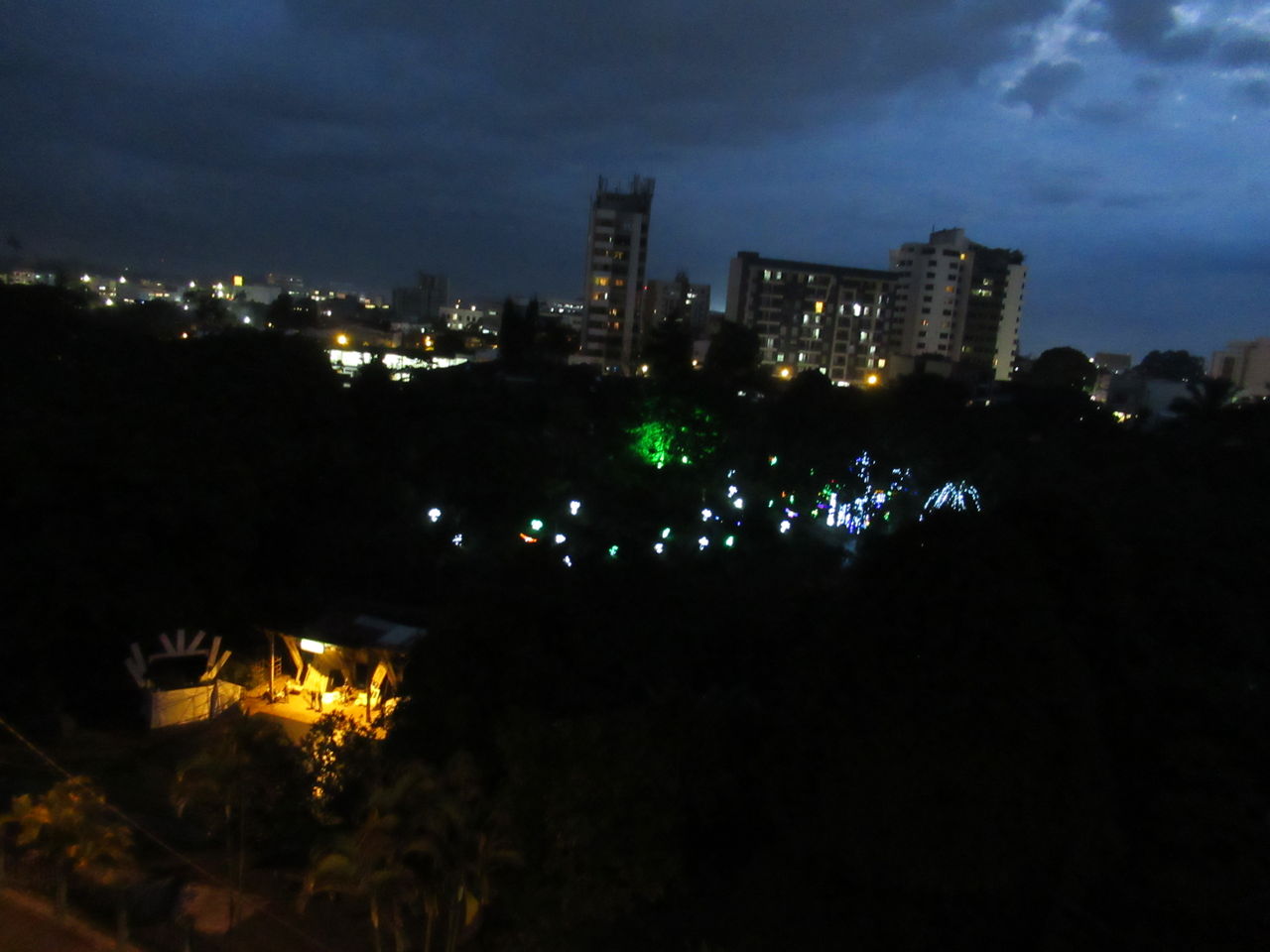 今度はベランダから撮った夜景です。真ん中あたりに白い点がたくさんありますが、これはラ・ビダ公園の中に飾られたクリスマス・イルミネーションです。左下に浮かんで見える灯は池(画面では暗くて見えません)の向こう側にしつらえられたステージ。12月になると一気にクリスマス・ムード全開になります。11月もあと1週間で終わり。私の任期もあと7か月です。
