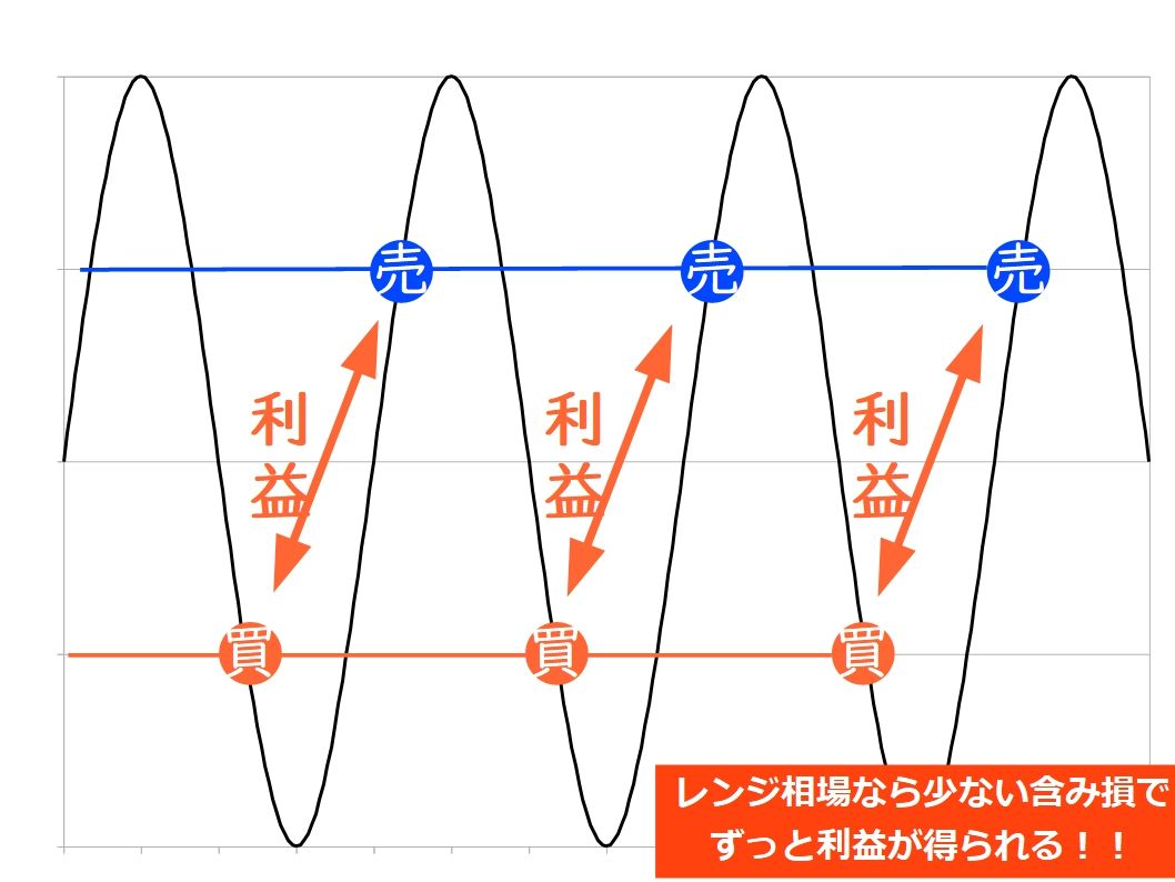 買いと売り両方を設定するとレンジが狭くなり、含み損が少なくて済みます。