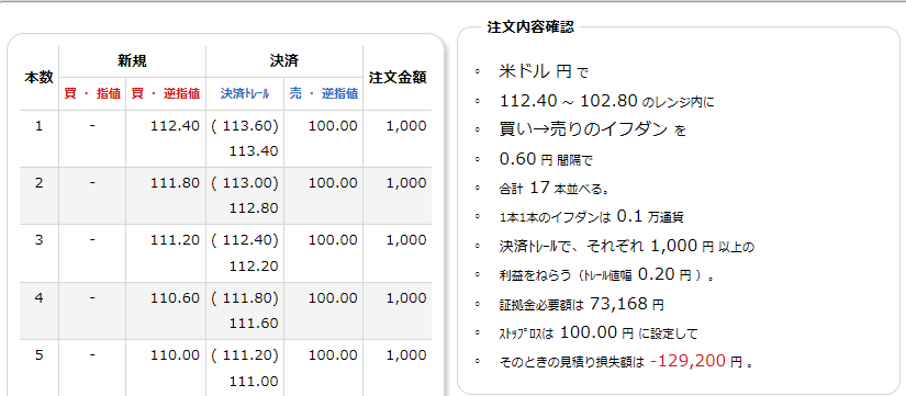 また、わたしが添削した設定に関しても欲を言えば、損切り価格は127円と98円などもっとレンジから外れた場所がいいです。