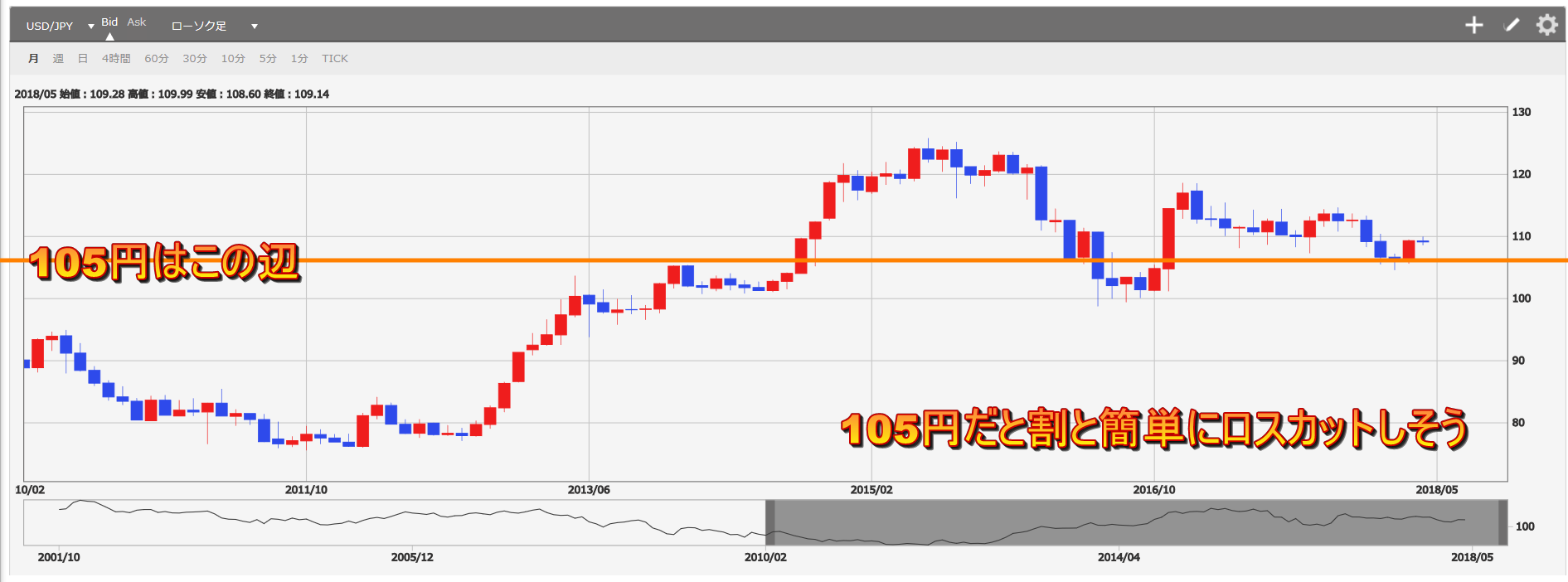過去の相場を見るとわかりますが105円なんて簡単に損切りされてしまいます。
