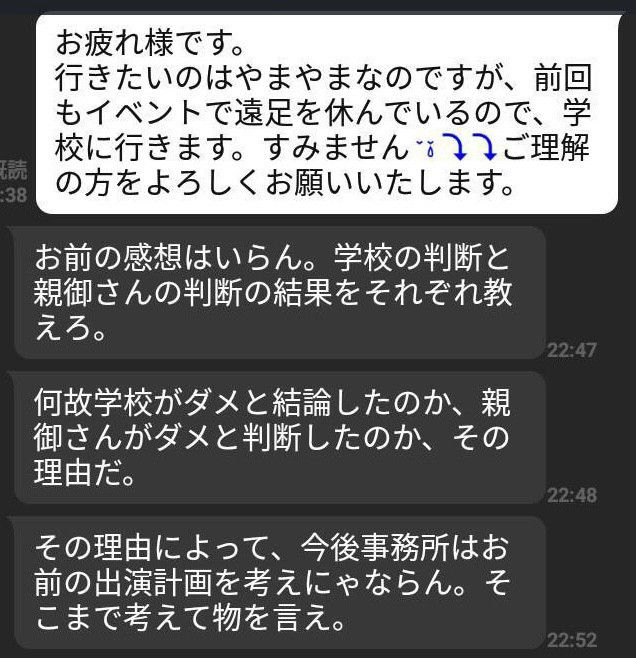 萌景は出先からSさんに電話をしたようです。電話を切ったあと一緒にいたお友達に、「謝らされた、私は何も悪いことしていないのに謝らされた」「なんで私が謝らないかんの? 本当に社長(Sさん)に裏切られた」と話していたそうです。このときは、何のことを謝らなければならなかったのか、お友達にも話さなかったといいます。亡くなった3月21日の朝、萌景が一緒にいたお友達とそのお母さんに、「私の(「愛の葉Girls」で活動した)2年間は何だったんだろう、夢を返してほしい」「社長(Sさん)に裏切られた。社長に1億円を払うように言われた」 と話していたと、あとから聞いて本当にショックでした。契約書には「ペナルティ料」の項目があり、規定違反や義務の不履行、タレント活動への事前連絡なしの不参加、遅刻の場合などにギャランティの50パーセント、または100パーセントをカット、足りなければ事務所から請求する旨が記されています。「1億円」というのは、Sさんが「違約金」をにおわせた発言だったと思えてならない。生前、「『何があっても萌景は辞めさせん』と社長(Sさん)に言われるよ」とも本人から聞いていました。
