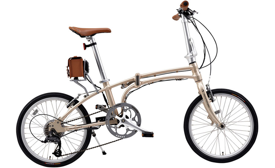 デイトナは元来、バイク(エンジン付き)のカスタムパーツを開発・販売するメーカーだが、社内の“自転車好き”が企画し、2015年にデイトナ初の電動アシスト自転車「DE01」が誕生した。DE01は、折りたたみできる20インチタイヤを履いた小径車(ミニベロとも呼ばれる)で、フレームが扁平形状になっているのが大きな特徴。実は、この形状はデザイン的なアクセントではなく、折りたたみタイプの自転車の課題となるフレームの剛性を確保することにつながっている。剛性が高くなることでフレームのゆがみが少なくなり、ペダルを踏んだ際の力がきちんと前に進む力に変換されるため、走行性もバツグン。また、モーターをリアホイールの軸(ハブ)と一体化してバッテリーをレザーケースに収めることで、電動アシスト自転車には見えないルックスとしている点もDE01シリーズならではだ。